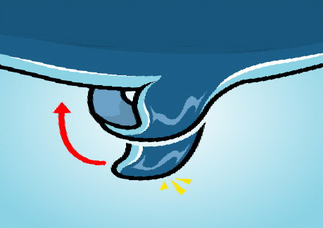 3.如果鯨豚呈現側躺或是仰躺,請立即將其扶正(背 鰭及呼吸孔朝上),翻身時請務必將胸鰭往內收貼近腹面,避免胸鰭骨折。